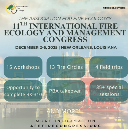 The 11th International Fire Ecology and Management Congress will be held in New Orleans, Louisiana from December 2-6, 2025. This event will include workshops, field trips, and 3 full days of presentations, discussion groups, and networking opportunities.
