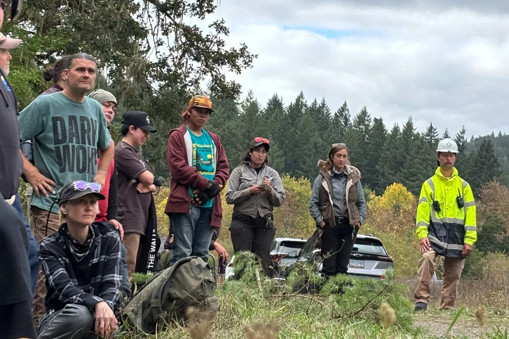 On October 8, 2025, the day of the burn, all participants and observers came together to discuss the burn leadership structure. We wanted a leadership structure grounded in place, centering Indigenous knowledge and people, and encouraging learning. So, we leaned into the teachings of the Pacific Northwest Canoe Resurgence Movement, whose approach to leadership fosters care, holism, reciprocity, respect, balance, and consensus politics. This model asserts that no role within the burn team is more important than another. Instead of framing leadership using a hierarchical model typical of prescribed burning, we acknowledged that each role is significant and consistent, transparent communication between roles is key to our safety and success.